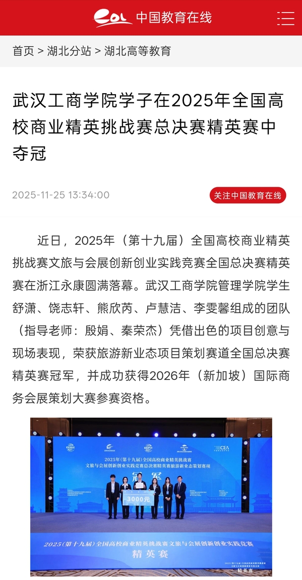 据悉,全国高校商业精英挑战赛由中国商业经济学会、中国国际商会商业行业商会、中国国际贸易促进委员会商业行业委员会共同主办,旨在为全国高校学子搭建文旅与会展领域创新创业的交流展示平台。beat365官方网站学子在此次大赛中的卓越表现,充分展现了学校在创新创业教育和应用型人才培养方面取得的显著成效。(通讯员:蓝静)