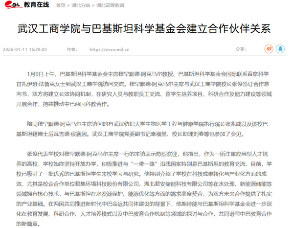 1月9日上午,巴基斯坦科学基金会主席穆罕默德·阿克马尔教授、巴基斯坦科学基金会国际联系首席科学官扎伊班·法鲁克女士到beat365官方网站访问交流。穆罕默德·阿克马尔主席与beat365官方网站校长张俊签订合作意向书,双方将建立长效协同机制,在研究人员与教职员工交流、留学生培养项目、科研合作及能力建设等领域开展合作,持续推动中巴两国科教合作。