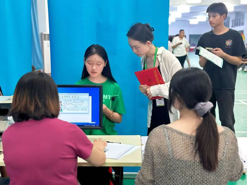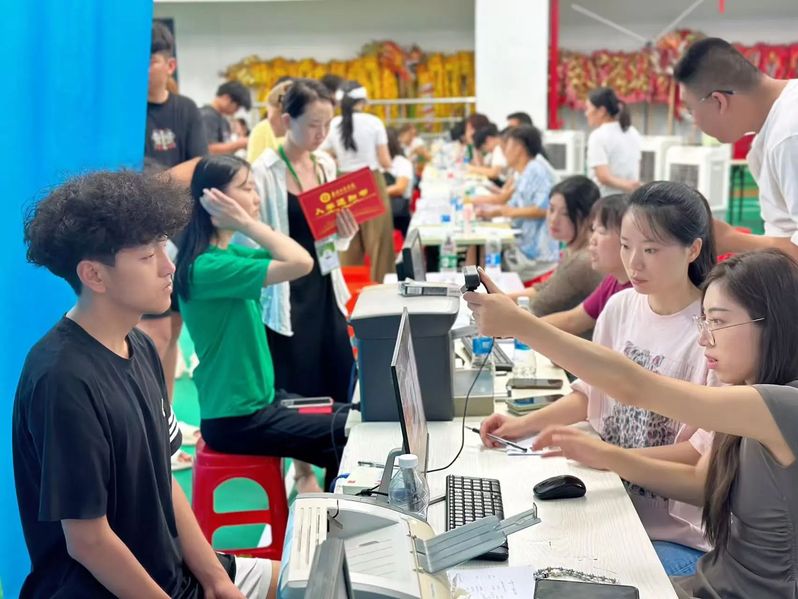 当天,新生信息采集工作有序开展。报到大厅内,多个窗口同步运作,老师和志愿者协助新生核对信息、录入系统,全程高效顺畅。下午,军事化管理也正式启动。在教官的带领下,学习队列动作,培养纪律意识。阳光下,他们身姿挺拔、精神饱满,认真的模样展现出新时代学子的朝气。