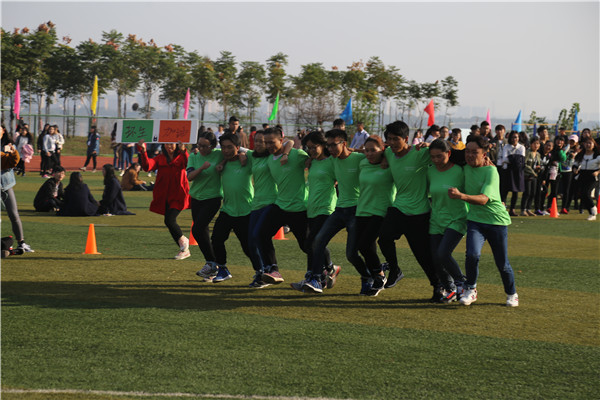 在多人多足比赛中,各学院代表队队员们团结一心,相互搭住队友的肩膀奋力向前奔跑。应用与技术学院的队员们以最快的速度冲向终点,环境与生物工程学院的队员们也不甘示弱,紧随其后,物流学院与文法学院的队员们稳中求进,依次到达了终点。最后,应用技术学院以7.70秒的成绩夺得第一。