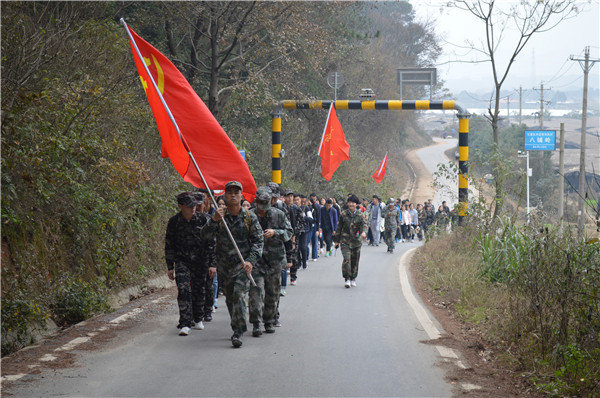 上午8:30,70名学生在该校综合楼广场集合,分成三个小分队,每个分队都由该校退伍大学生担任队长,协调本队的一切工作。三支队伍从综合楼广场出发,沿途经过湖中医、武科大、东澜岸广场、武交职、陈家畈、江夏绿道(西线)等地,最终到达武昌大道二道口公交站。行军速度严格按照部队化要求,快慢结合,同时设定了奔袭路段,让每一名参加模拟长征徒步行的学生都切实体验长征的艰苦。为增加本次活动的特色,行军途中组织各队自由拉歌,同时在休息区域组织了擒敌拳表演和撕名牌活动。