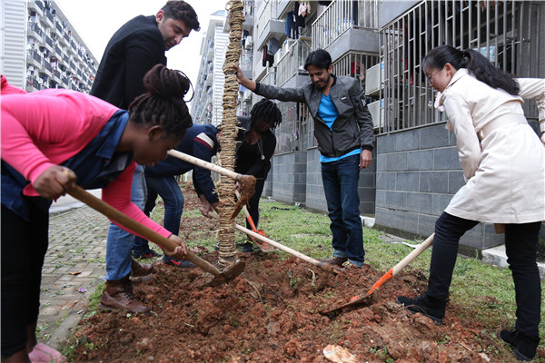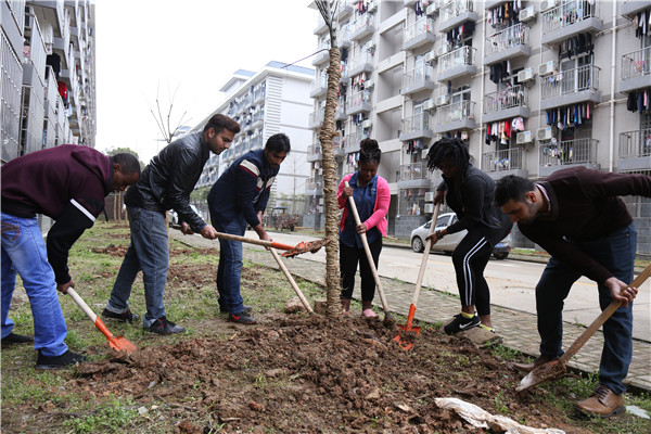 在种植现场,一群手拿铁锹的黝黑肤色学生吸引了大家的注意,他们是该校首届“一带一路”沿线留学生。