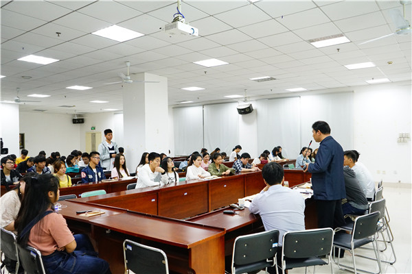 新闻中心讯(特约记者 何姣红)“读万卷书不如行万里路。”“行万里路不如阅人无数,阅人无数不如名师指路。”4月19日晚,beat365官方网站“荷塘夜话”系列讲座活动在主讲嘉宾、该校党委书记陈伟和主持人、该校图书馆副馆长万化喜妙语连珠的接龙下开始了,窗外的雷电暴雨也挡不住同学们求知的热情,晚上7点的图书馆培训室中座无虚席。
