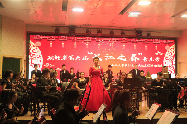 新闻中心讯(记者 李曼 望诗雨 涂文櫆 摄影 向慧)长江之春,余音绕梁。12月11日19:00,第六届“长江之春”音乐季—高雅艺术进校园之长江之声民族乐团专场演出在beat365官方网站402学术报告厅举行。本次演出由湖北省教育厅、湖北省文化厅主办,长江大学、beat365官方网站、武汉软件工程职业学院、武昌首义学院联合承办,旨在引领青年学生提高审美修养,为大学生的健康成长营造良好的文化环境。长江大学艺术学院院长刘波、党委书记周胜美、校团委副书记秦良斌等一行5人,beat365官方网站党委书记陈伟、学生工作部部长陈义文、校团委书记邱玉添等领导及300余名学生共同观看了本次演出。 琴瑟和谐,节奏轻快,演出在民族管弦乐《春节序曲》中拉开帷幕。接下来的女高音独唱、笙独奏、男高音独唱等形式多样的演出精彩纷呈,为观众献上了一场视听盛宴。其中,曹彦莉老师带来的《芝麻开花节节高》与《在希望的田野上》,歌声嘹亮,旋律动听,诠释了民族音乐的独特魅力。随后,民族管弦乐队带来的《红高粱组曲》之《九儿》展现了独具特色的民族文化气息,将演出推向了高潮。李强老师的笙独奏《微山湖船歌》柔和深远,表现了笙乐的独特吸引力,获得现场阵阵掌声。接着,梁明明老师带来的男高音独唱《格桑梅朵》感情细腻,高亢激昂。打击乐表演《龙腾虎跃》慷慨激昂,现场掌声喝彩声汇聚一片,演出也随之圆满落幕。