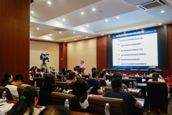 中南财经政法大学陈芳教授在会上做了《民办高校高素质稳定型核心师资团队建设》的主题报告,她分别从民办高校师资面临的问题、高素质稳定型核心师资团队组建、基于素质模型的核心师资团队培养、构建以需求为导向的核心师资团队激励措施等四个方面向大家做了详细介绍。陈芳教授表示,教师队伍建设中首先要了解三个关键词“核心师资队伍、高素质、稳定型”,这是基于学校的战略定位来确定的;其次要通过团队组建、团队培养、团队激励三大步骤分别实现人岗匹配、素质提升和留住人才。在组建团队之后,要从教学、实践能力、科研等各方面入手,鼓励“一对一、老带新”,通过项目、课程“干中学”培养核心师资团队。最后陈芳教授表示还需要从四个方面构建以需求为导向的激励措施:一是提高核心团队的薪酬待遇,保证核心团队的稳定性;二是建立社会评价与校内评价相结合的教师职业生涯晋升机制;三是加强人文关怀,留住核心人;四是多种方式为教师提供各类平台。