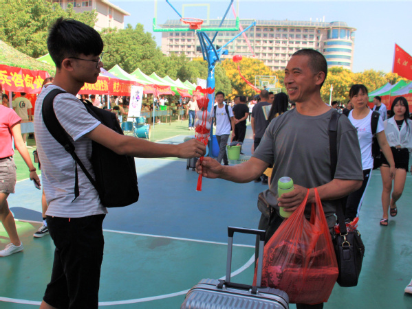 图为大一新生将收到的玫瑰花送给父亲 摄影:郭冰雪
