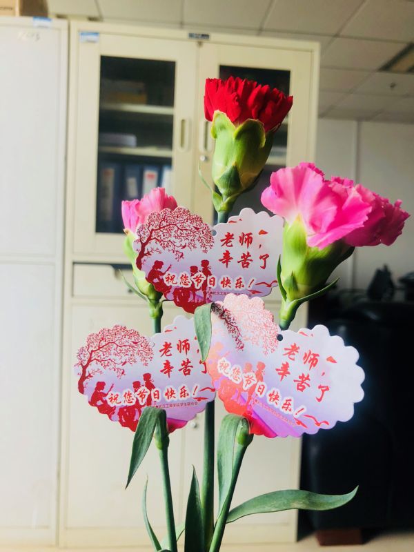 图为校学生会的学生送康乃馨给老师 摄影:孙欢欢