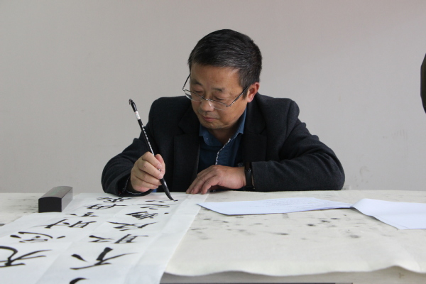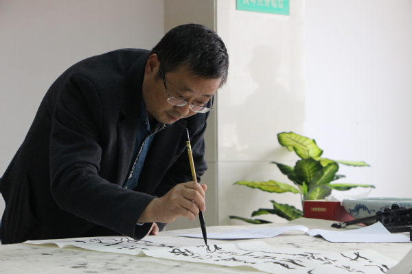 陶梅生书写的隶书厚重有力而又不失隽秀灵动,左宗文的草书潇洒飘逸、行云流水,让周围观看的同学们拍案叫绝,各位书画爱好者也纷纷亮出了各自的绝活,室内充满了浓郁的书香文化气息。
