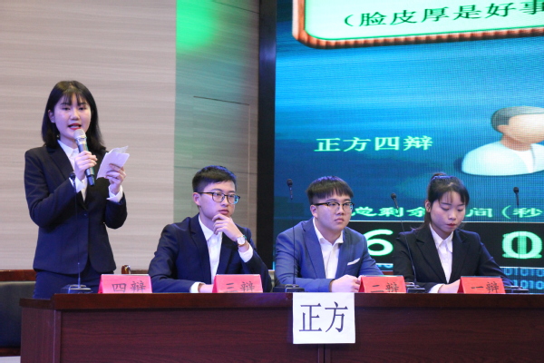 “脸皮厚是优秀心理素质的表现,能让我们活出自我、不畏惧他人眼光。随着社会的发展,需要我们去发挥脸皮厚的优势,去勇于展现自身优点”,正方四辩以一句话进行最终结辩。反方四辩则总结道:“在个人层面上,脸皮厚是不顾及他人感受,同时没有羞耻心的人不是一件好事情,是对他人的不负责。”