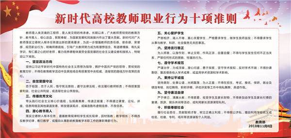 教师是人类灵魂的工程师,是人类文明的传承者。长期以来,广大教师贯彻党的教育方针,教书育人,呕心沥血,默默奉献,为国家发展和民族振兴作出了重大贡献。新时代对广大教师落实立德树人根本任务提出新的更高要求,为进一步增强教师的责任感、使命感、荣誉感,规范职业行为,明确师德底线,引导广大教师努力成为有理想信念、有道德情操、有扎实学识、有仁爱之心的好老师,着力培养德智体美劳全面发展的社会主义建设者和接班人,特制定以下准则。
