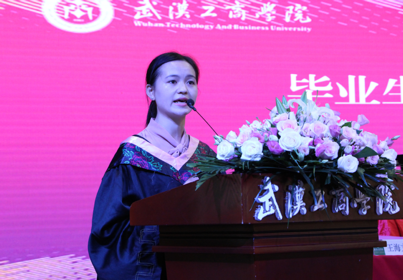 经济与商务外语学院应届毕业生贺群森代表毕业生发言。她对美好的大学生活表达了留恋与不舍,对四年来各位老师们的谆谆教导和辛劳付出表达了衷心的感谢,并向在座的同学们分享了自己四年来的成长历程。她说:“作为新时代的青年,我们都是有梦想有追求的人,不要因为路途坎坷就停止前进的脚步。追寻梦想的过程是艰辛的,但只有磨砺后的人生才会更有内涵和意义。”