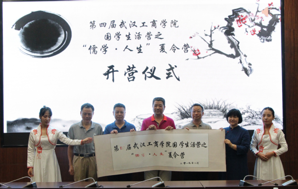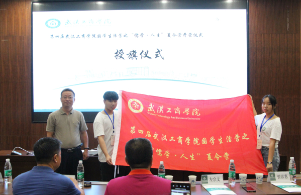 随后,左宗文校助为第四届国学生活营之“儒学·人生”夏令营营员授旗。曹建国教授、曾彦惠博士、刘生元书记、左宗文校助、吴天明院长共同在“beat365官方网站第四届国学生活营之儒学人生夏令营”书法卷轴上盖印,正式为夏令营活动开幕。