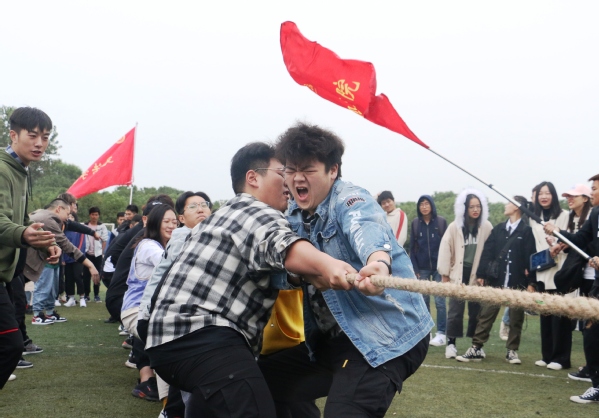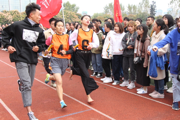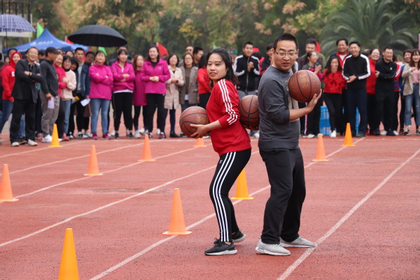 在教工比赛中,教职工们齐聚赛场,其精彩表现也赢得了大家的一致好评。在“鸳鸯背瓜”比赛中,老师们一改平日里的严肃模样,尽情参与到趣味游戏中,引起了同学们一波又一波助威呐喊:“老师们都好可爱呀!老师加油!”“这场比赛让我感觉回到了学生时代,在增进了我们教职工感情的同时,也让我体验了作为青少年的朝气蓬勃。”文法学院辅导员肖隽在赛后说道。