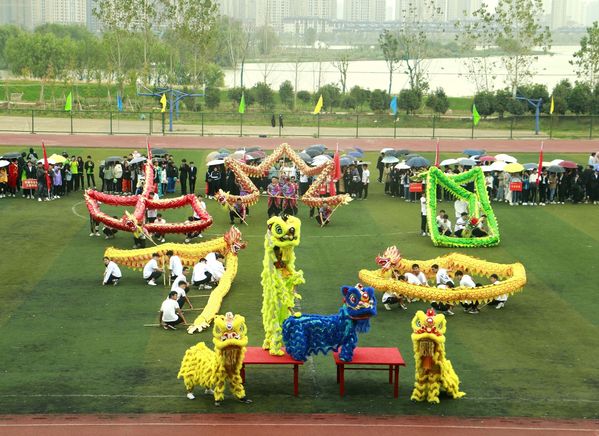 舞龙舞狮、武术、古典舞、秧歌、拉丁舞、街舞、啦啦操、歌曲等16个才艺表演在沥沥细雨中轮番上演,吸睛无数。“中国”“70”“五角星”等由5条色彩斑斓的巨龙摆出的造型,“与军运同行,向祖国献礼,育文体素养,展青春华章”“祝福新中国70华诞”等横幅和口号赢得现场阵阵掌声。其中20名来自韩国和马来西亚的留学生,他们活力四射,带来了富有创新创造精神和朝气蓬勃力量的舞蹈表演,也惹得现场尖叫不断。