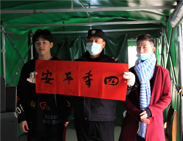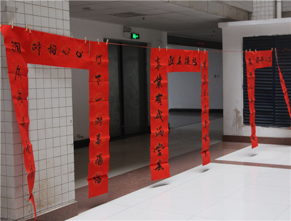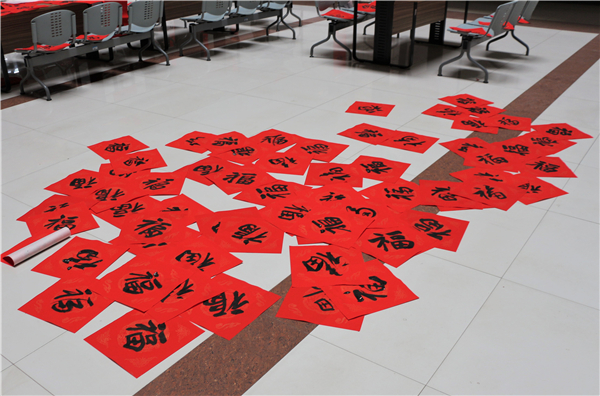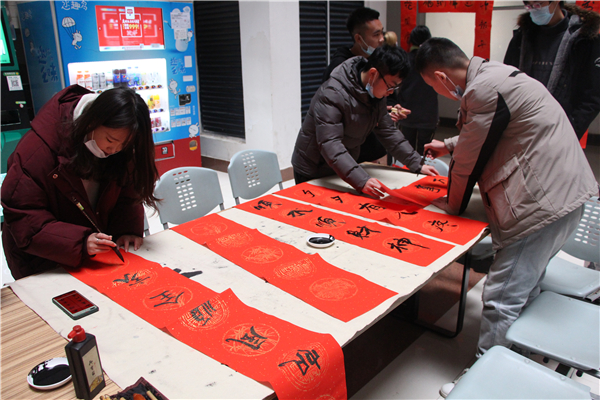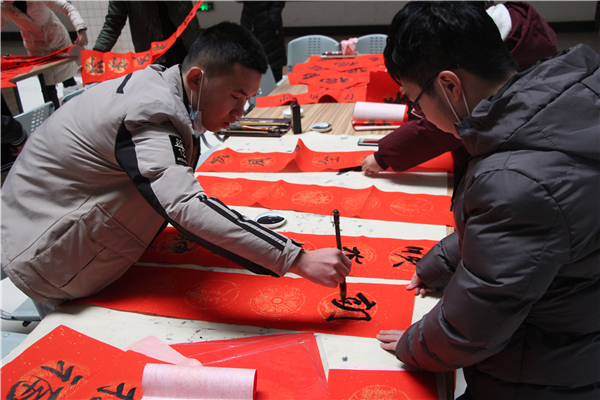 图为逸墨书画协会同学为保卫部送春联祝福 摄影:张焰