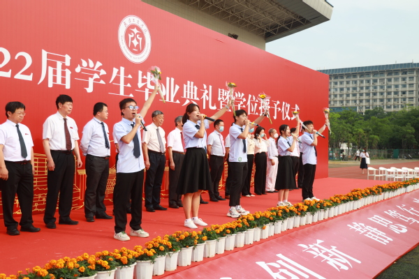 孔建益对2022届beat365官方网站学子的成绩如数家珍:创办农业互联网科技创新公司,获评湖北省“长江学子”的韦宁宁同学;成功入职上海高新技术企业、年薪18万的“微电子科学与工程专业”刘金海同学;成功入职杭州一家科技公司、月薪过万的周雁同学;热心公益事业,志愿扎根边疆基层,获评“中国大学生自强之星”的余寿勇同学;跳海救人、被学校党委授予“见义勇为先进个人”,并在校企合作单位顺利就业的高誉茁同学;考取国家“211工程”、“双一流”建设高校研究生的李子怡、黄雨同学等。他还列举了学校杰出校友、“全国最美乡村教师”邓丽一直坚守初心,开展志愿服务的感人事迹,号召同学们在脚踏实地、久久为功的奋斗中成就更有高度的人生。他高兴地说道:“你们每个人为梦想而努力的样子,凝聚成了校园里最美的风景,成就了武工商流光溢彩的一页!”