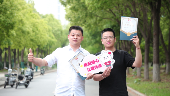 图为学校团委书记邱玉添和谭志强献血后合照 摄影:芮雨欣