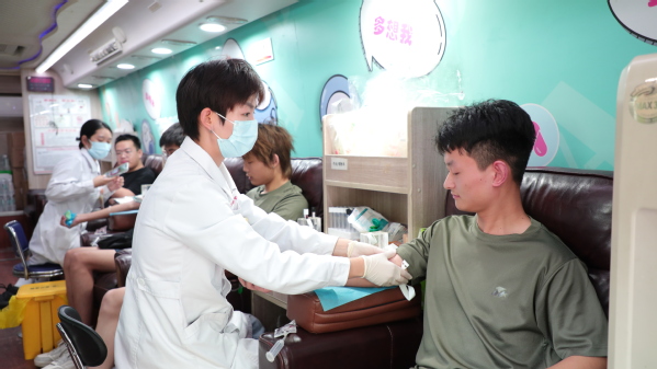 图为谭志强在献血 摄影:芮雨欣